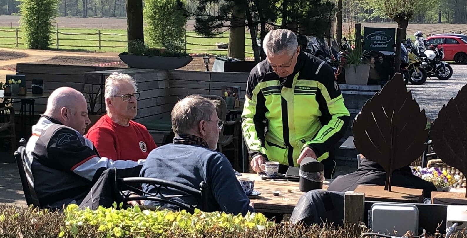We vertrokken vanaf het parkeerterrein Oude Landen en reden door het karakteristieke Brabantse landschap richting ons koffieadres, Boerderijterras Jacobushof, net voorbij Lennisheuvel. In de warme ochtendzon genoten we daar van een kop koffie op het buitenterras.