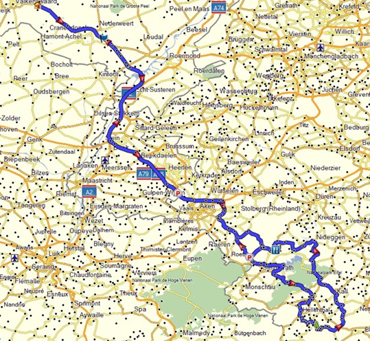 De starten bij het Fletcher Hotel Jagershorst in Leende. Via de A2 naar de grens bij Heerlen waar we na 83 km even stoppen om de benen te strekken. Vervolgens nog een stukje autobahn en daarna bij Brand deze verlaten richting de Eifel. Na 46 km komen we aan bij onze koffiestop Talschenke in het dalletje Simonskall. Helaas is een gedeelte van het dal tijdelijk afgesloten dus gaan we na de koffie terug en rijden we het dalletje weer uit. Na 68 km gevarieerde Eifel wegen, waarin grote en kleinere wegen elkaar afwisselen lunchen we "Bij de Boom" (eigen lunch meenemen dus) met een mooi uitzicht op het klooster van Manscheid. Na de lunch vervolgen we onze weg en genieten we van de mooie Eifel wegen. Hierbij stoppen we na 30 km nog even om te tanken in Gmund (Aral) en na nog eens 52 km maken we een laatste tussenstop om nogmaals de benen te strekken. We zijn dan bijna weer in Brand waar we de snelweg weer opgaan en onze rit na 97 km beëindigen bij het BP tankstation aan de A2 bij Nederweert.
